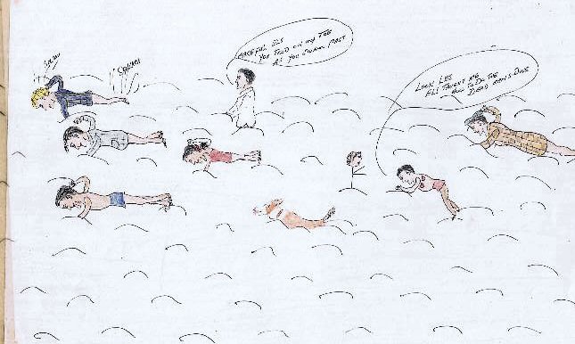 ![]() Swimming at Sorrento. Stan is splashing (as usual). Ron calls out: "Careful, Els. You trod on my toe as you swam past." Bobby shouts: "Look Les! Els taught me how to do the dead man's dive". |