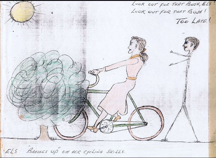 ![]() Els brushes up on her cycling skills. Les tries to warn her of the impending collision with a bush, but is too late. |