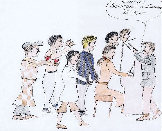 ![]() Syd conducts a family singalong. He complains that someone (whose name is "Binch") is singing 'B' flat. The singers are Ern, Bobby, Ron, Stan BINCH, Len and Les, with one of the sisters (Dot or Els) playing piano. |