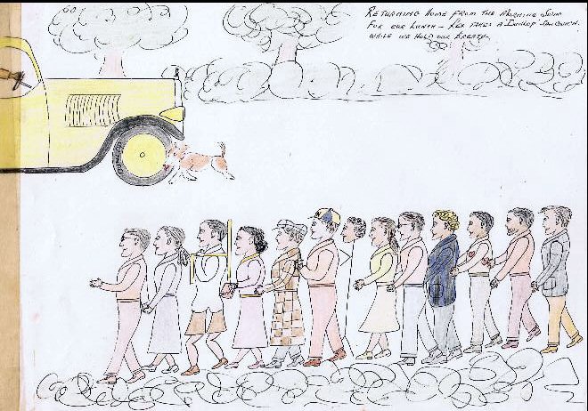 ![]() Returning home from the morning swim for our lunch, Rex takes a "Dunlop sandwich" while we hold our breath. Peter Meyer holds hands with Dot, Syd carries a chair, Mum, Ern, Reg, Les, Els with Boz Corlett (his real name was Elliott), Stan, Bobby, Len and Syd. |