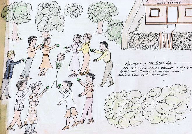 ![]() Revenge! The biter bit! Les the bidgee widgee thrower is set upon by all and sundry returning from a morning walk to Diamond Bay. |
