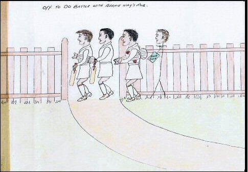 ![]() Off to do Battle with Bernie Way's mob. Here are Syd, Len and Bobby taking this up-coming encounter seriously, with Les carrying the scorebook. |
