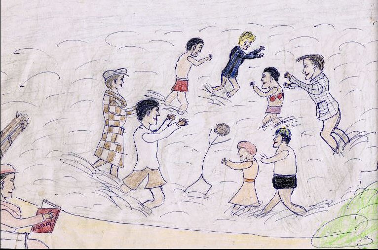 ![]() Everybody in! As Mum reads sedately on the shore, the Reeds and co take the plunge: Ern, Ron, Len, Les, Stan Binch, Bobby, Els, Syd and Reg. |