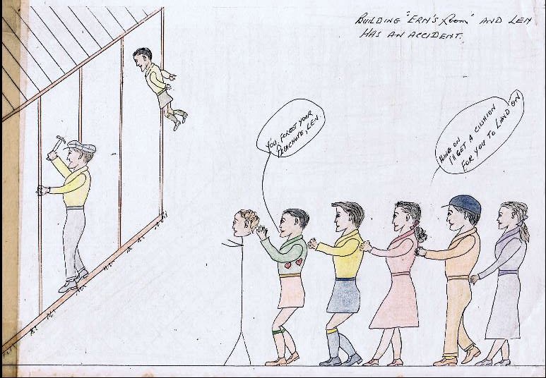 ![]() Building "Ern's Room" and Len has an accident. Bob wisely reminds Len that he has forgotten his parachute as Ron offers to get a cushion for Len to land on. |