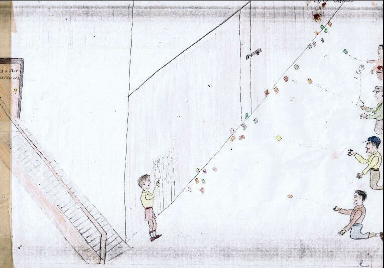 ![]() Kite production and a matter of priorities. Les needs rags to provide ballast in the kite tails. He tries to cadge more rags from Mum. But she is concerned that there will be no rags left to make dusters. Les pleads anxiously: "But Mum, we have to have tails for our kites." Note the flour: in those days, glue was concocted simply by mixing a flour and water paste. Apparently Mum gave in: see further down the page ... |