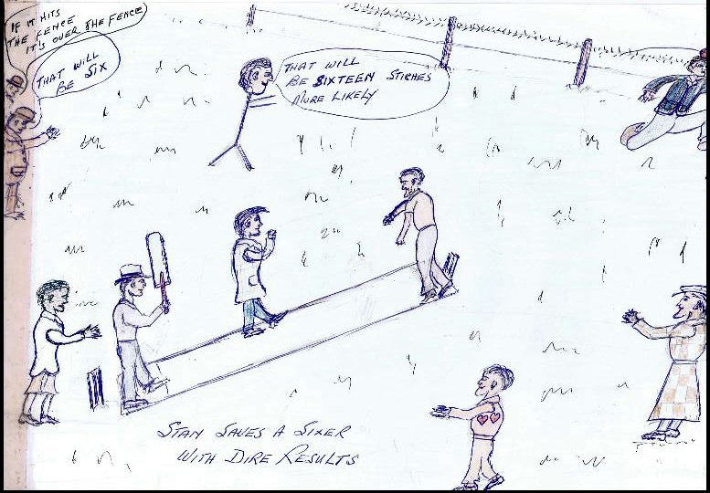 ![]() Stans saves a sixer with dire results. A spectator remarks: If it hits the fence, it's OVER the fence!" Another onlooker comments: "That will be six." Les: "That will be sixteen stitches more likely ..." |
