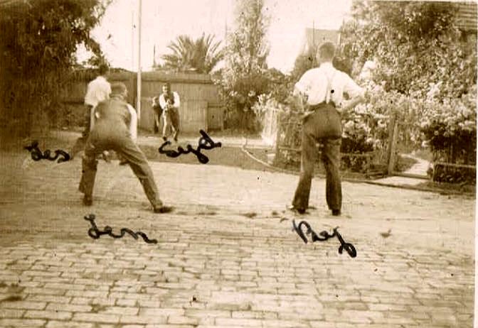 Above (row of 3 photos), Bobby poses with proud Dad and Mum. It is devestating to think that once Bobby sailed for the Middle East, he did not see his father again. The lower photo was posed in the Holy Land (probably at Mr Feigenbaum's worthy establishment) as a jest -- a postcard to send home and enthrall the rellies. Bobby portrays an Aghan brigand on the right. Just as an aside, Mum was visited by a policeman during the early 1940's and almost fainted. "Oh! I have 2 sons fighting in the War", she gasped, thinking that this uniformed man was the harbinger of bad news. "No, lady, I'm only here to check on one of the neighbours who's been burgled!" |