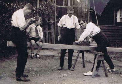 ![]() Doing the washing. Just as at Downs Street, the Sorrento property had a laundry. But this one was outside. Len chops wood for the firebox which heated the water in the copper. |