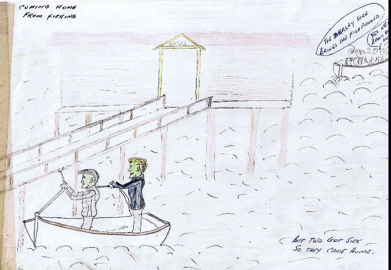 ![]() But two got sick so they came home. Coming home from fishing. Syd and Stan look green. They have evidently had (in the vernacular) "a technicolour yawn" or two. The more hardy fishermen can't help but wryly comment: "The berley sure brings the fish around." "Yes, we must bring them out again." FOOTNOTE: during WWII, Bobby was one of only 4 men on a US troop carrier who was NOT at all seasick, thus winning the master's praise. |